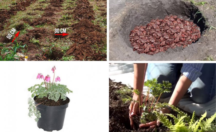 - Посадку дицентры следует начинать с правильной подготовки грунта. Нужно хорошо, достаточно глубоко перекопать почву и смешать ее с компостом, чтобы улучшить структуру. Затем каждый год осенью мульчируют почву компостом, чтобы весной смешать его с почвой. Такой весенний слой компоста позволит поддерживать реакцию почвы на нужном уровне и правильное количество питательных веществ. Гумус, содержащийся в компосте удерживает воду, растение будет летом лучше расти, что позволит вырастить крупный кустик быстрее.