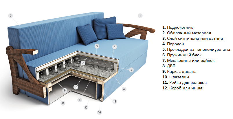 Итак, современные диваны имеют следующую конструкцию. Их основными элементами являются каркас, обивка, набивочные материалы, а также в большинстве случаев и трансформирующий механизм.
