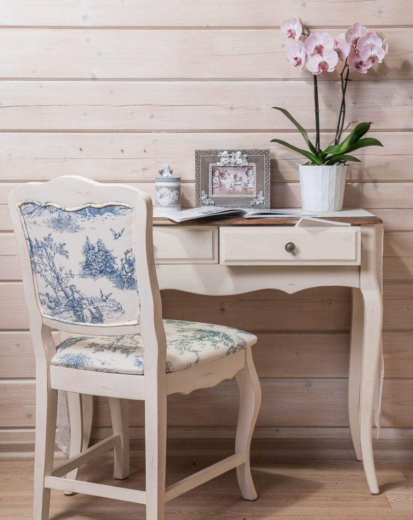 - Изящная, светлая, часто белая или бежевая мебель. Традиционно ее делали из ореха, окрашивали в серовато-синий и зеленый цвета. Буфеты, комоды с множеством ящиков. Плетеные кресла и столики. Мебели не должно быть много и она должна всем своим видом показывать, что передаётся из поколения в поколение.