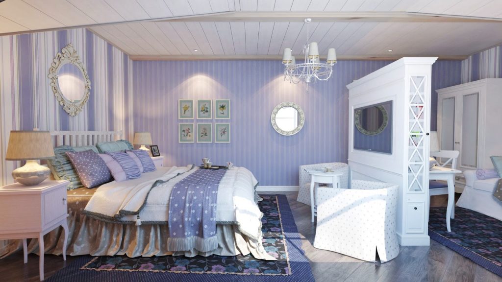 Для спальни. Центральный элемент спальни — кровать. Она должна быть большой, удобной, со множеством подушек и красивым покрывалом. Дополнить обстановку поможет небольшой комод, туалетный столик с зеркалом. Вся мебель в светлых тонах, аура томного прованского блаженства и умиротворения.