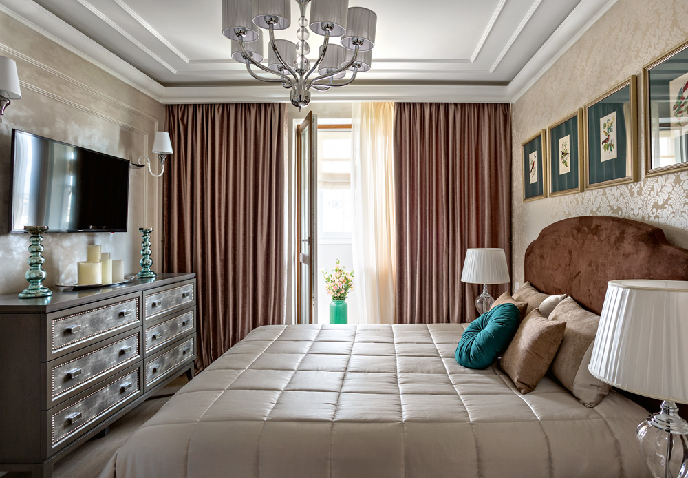 На потолке смонтирована закарнизная подсветка. Когда она включена, потолок кажется выше. Светлые тона и немногочисленные аксессуары — то, что надо для небольшого помещения, чтобы не возникало перегруженности. Бирюзовые аксессуары разбавляют монохромность