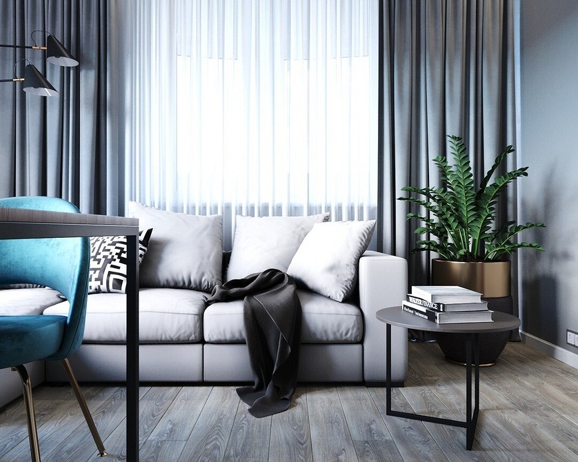Если необходимо зонирование таких маленьких помещений, как 12 и 16 кв. м, 11 и 14 кв. м, перегородки будут слишком громоздки, вместо них можно использовать шторы. Плотная ткань создаст полную изоляцию, а прозрачный тюль слегка обрисует границу, сохраняя общность помещения.