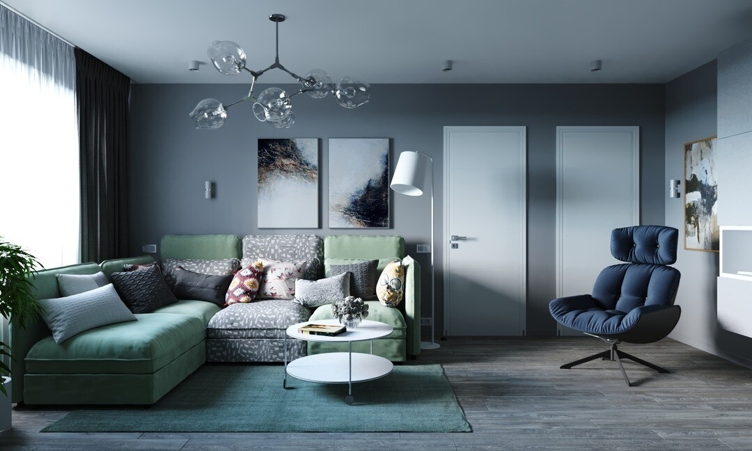 - несложно скорректировать геометрию площади с помощью мебели одной раскраски;