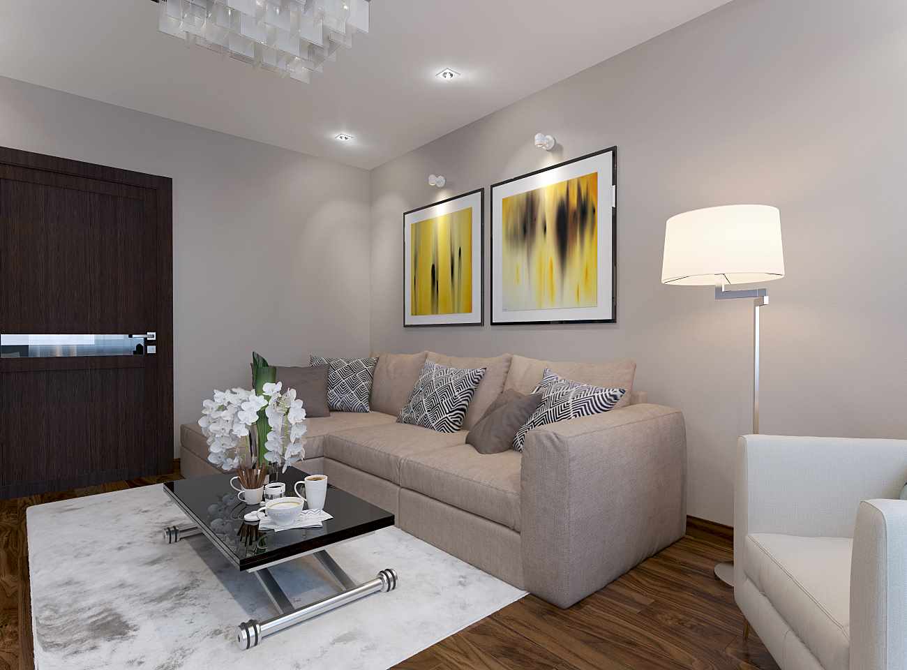Чтобы гостиная выглядела просторной, в ней должны присутствовать светлые однородные тона.