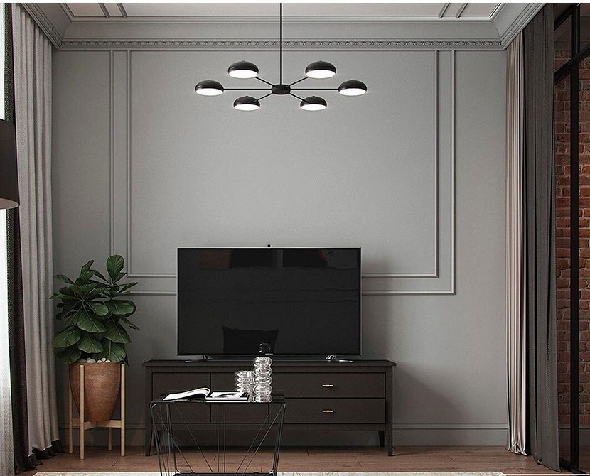 - Источники искусственного света должны освещать каждую зону зала, поэтому рекомендуется установить много точечных потолочных светильников. В зависимости от выбранного стиля интерьера дополнить их можно напольными торшерами, настольными лампами или настенными бра.