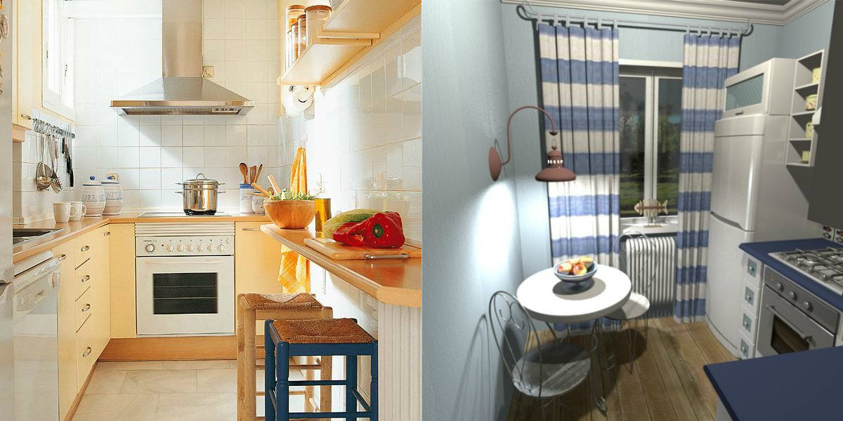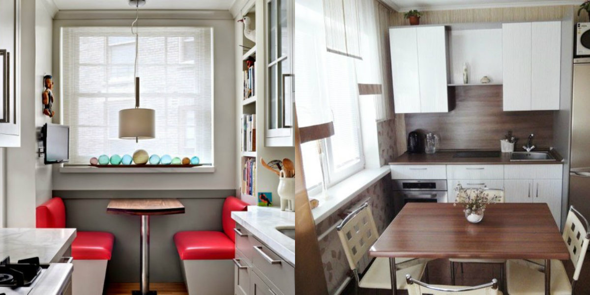 Хорошим решением для малогабаритной кухни будет 2 стены отдать под встроенную кухонную мебель с рабочей поверхностью и шкафами (сюда же, если получается, вписать небольшой холодильник), а столик сделать маленьким, возможно даже — откидным у стены.