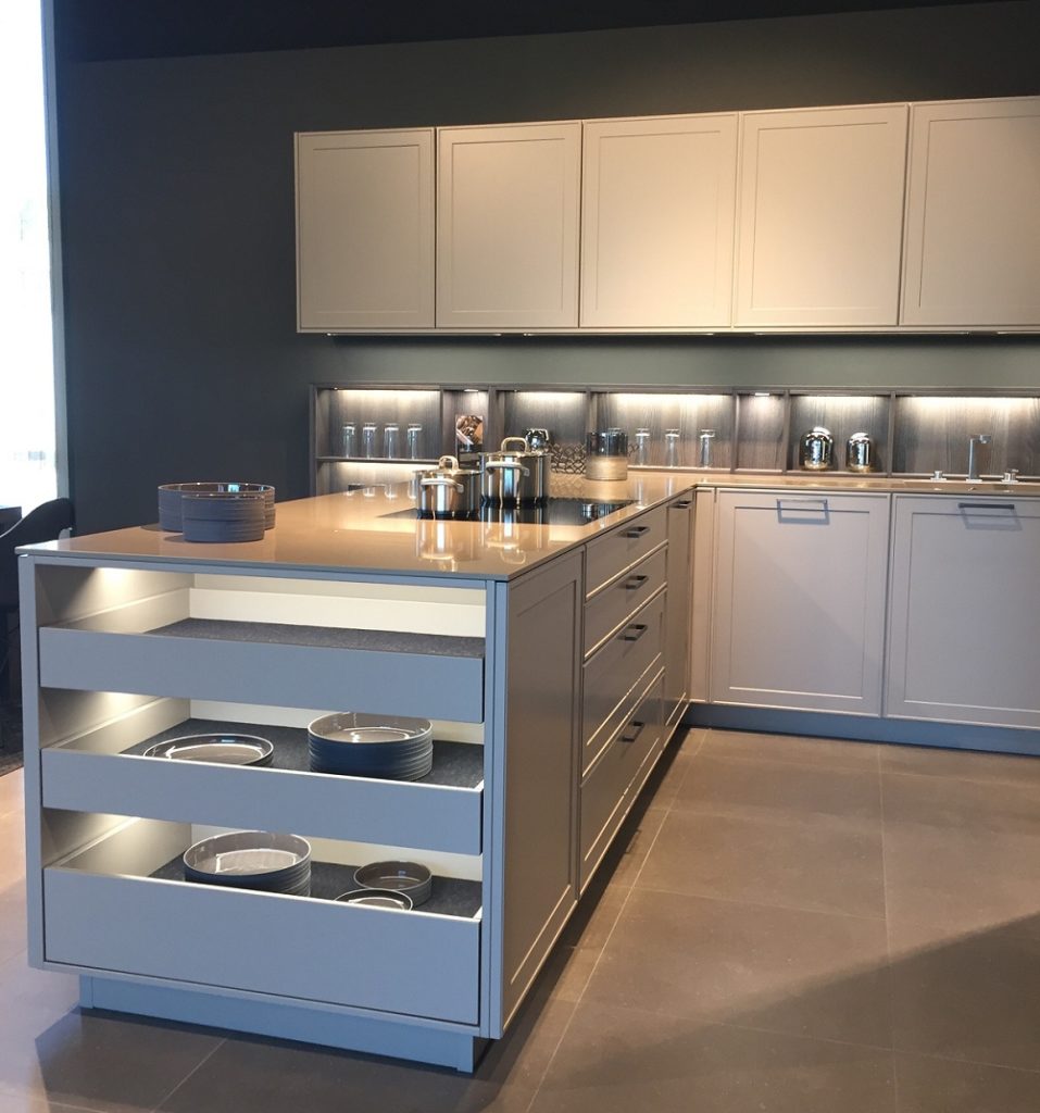 - По словам дизайнеров сейчас особой популярностью пользуется матовый фасад благородного бронзового цвета с вертикальными ящиками для хранения различной кухонной утвари.