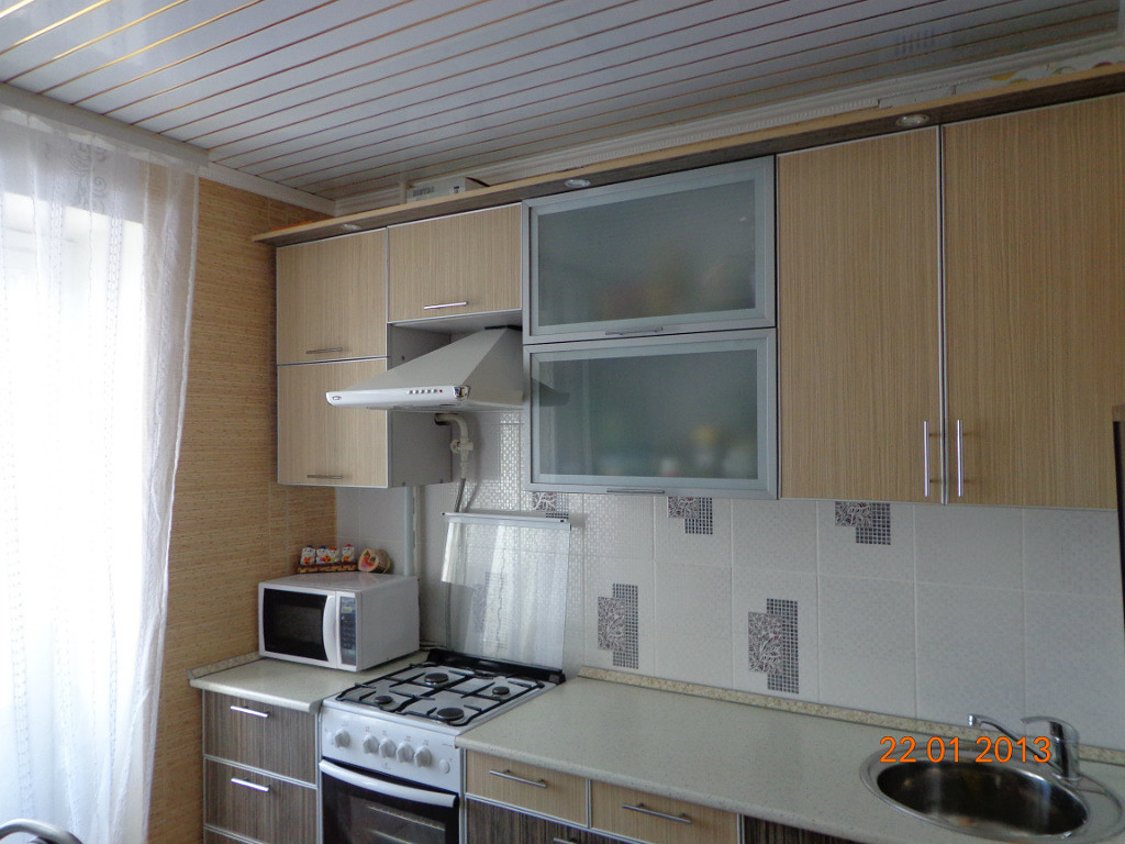 В верхнем ярусе шкафчики (кроме того, что над вытяжкой) разделены 2-мя или 3-мя полками (моя кухня слишком мала, чтобы пространство над стоящими баночками было пустым).