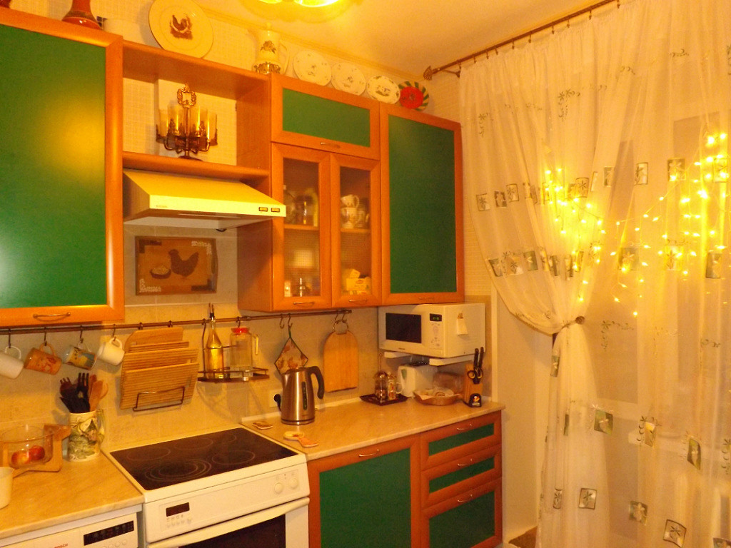 Микроволновка – LG с отделкой нержавейкой, малогабаритная, но объемом 20 литров, с грилем и множеством ненужных встроенных функций – установлена в верхнем ярусе кухни из соображения не занимать рабочую поверхность. Холодильник пока используем старый – ему уже 12 лет.
