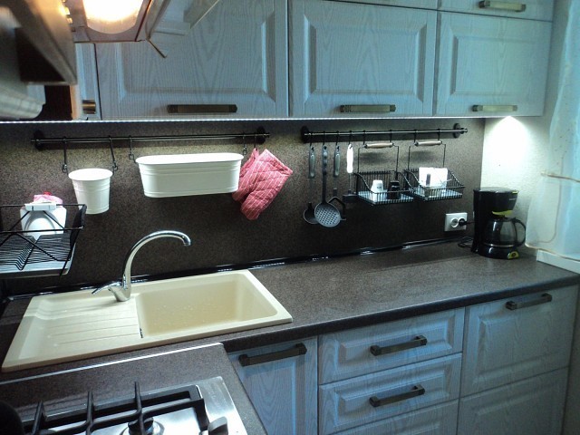 Металлические рейлинги также помогают решить проблему небольшой кухни. Установить их можно прямо на кухонном фартуке. Рейлинги отличаются высокой функциональностью, они практически не занимают места и помогают держать под рукой все необходимые кухонные аксессуары — прихватки, половники, лопатки, бумажные полотенца, баночки со специями, и многое другое.