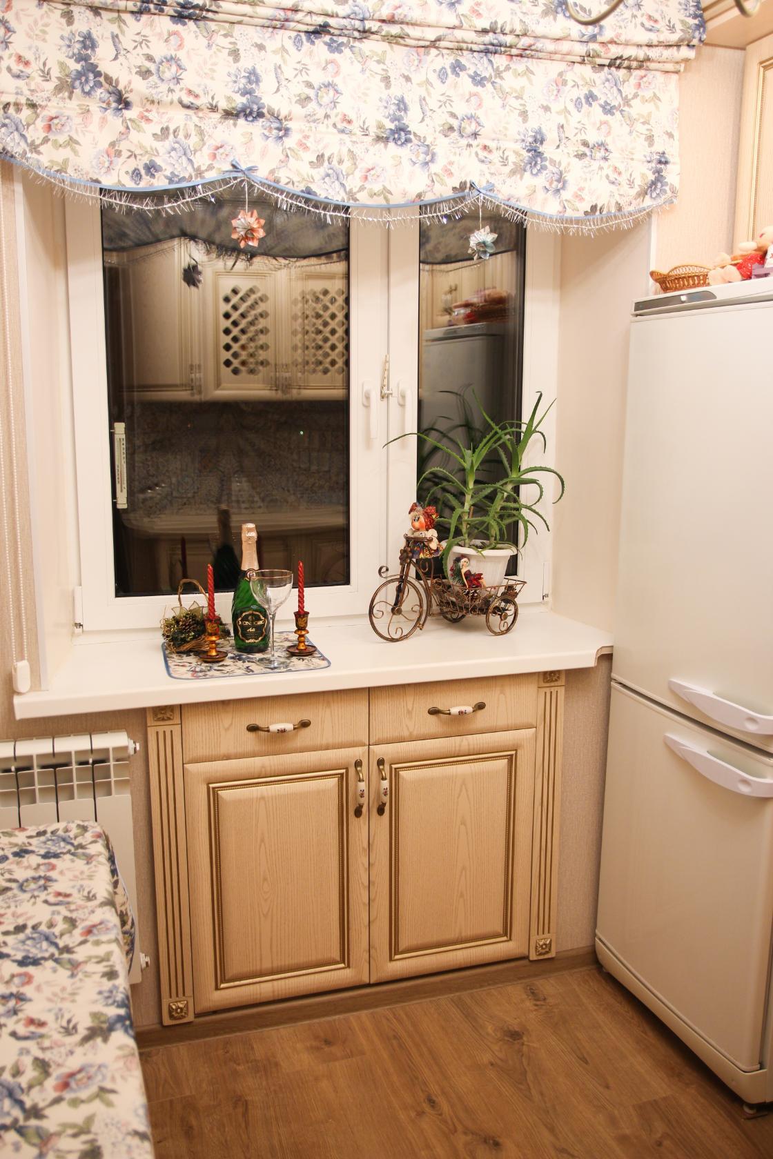 К примеру, прямо под подоконником можно обустроить шкафчик для хранения посуды и другой кухонной утвари.