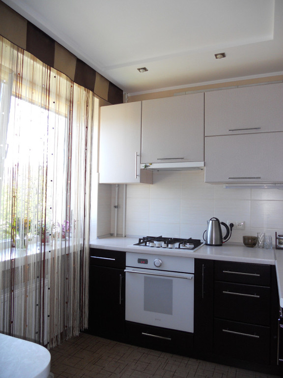 Освещение должно быть по-максимуму естественным. От использования тяжелых портьер следует отказаться. Лучше украсить кухню легкими полупрозрачными занавесками, римскими или рулонными шторами. Свет приносит с собой ощущение простора, поэтому не ограничивайте его, но и перебарщивать не стоит. Обязательно приглядитесь к каталогам фотографий реализованных на практике проектов, благодаря интернету с этим не должно возникнуть проблем. Подобные каталоги являются неисчерпаемым кладезем для идей, там вы наверняка почерпнёте много интересного для себя.