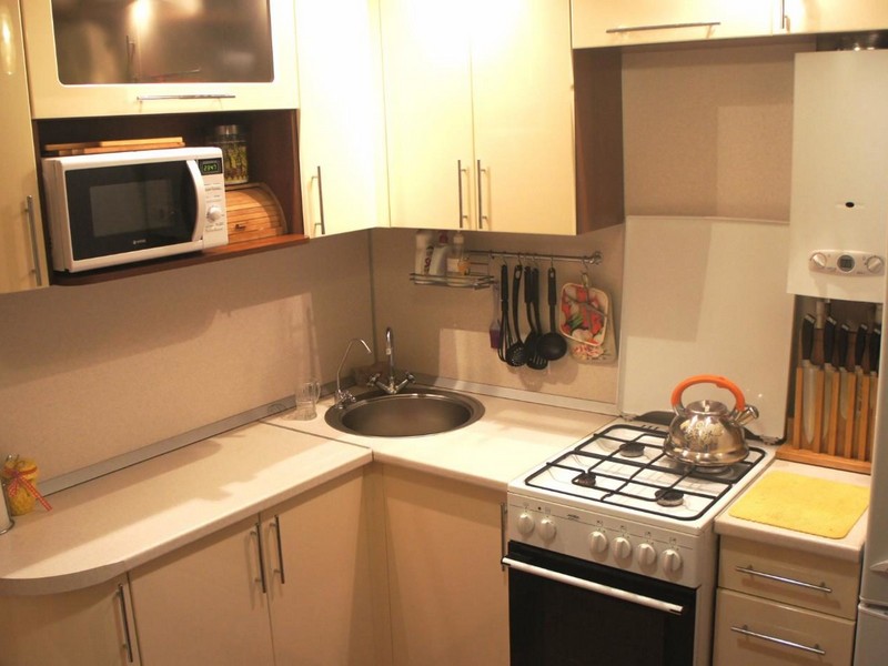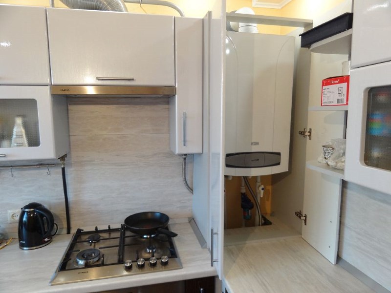 Все «архитектурные излишества» (например, газовую колонку), следует замаскировать под навесной шкаф, не забыв перед этим тщательно изолировать стены внутри него.