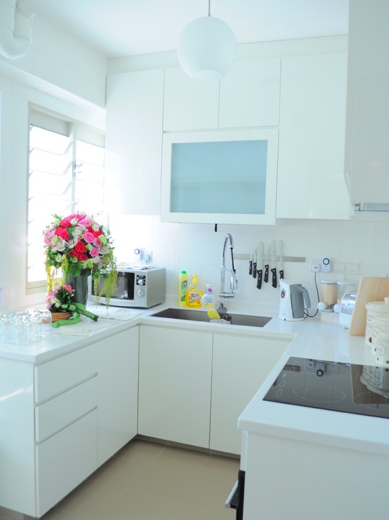 На малогабаритной кухне светлые тона должны преобладать во всем — это касается и мебели, и потолка, и стен, и даже пола.