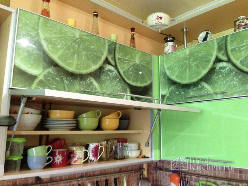 Если сделать в них стеклянные полупрозрачные дверцы и установить светодиодную подсветку, потолок зрительно будет казаться выше, а кухонный фронт легче.