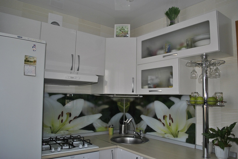 Увеличить пространство визуально помогут зеркальные, стеклянные и глянцевые поверхности, используемые в фасадах гарнитура, при обустройстве кухонного фартука и даже столешниц.