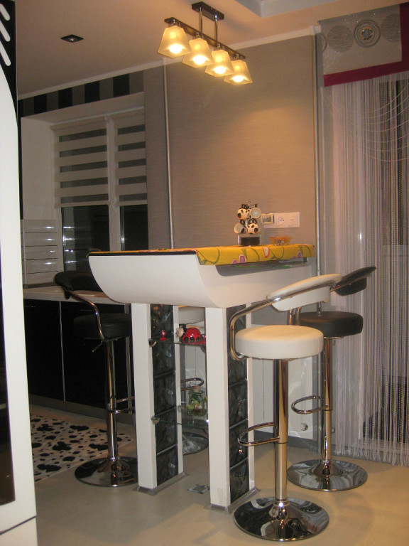 Обеденный стол со стульями отнимает немало места на кухне. Отказаться от него полностью не всегда возможно, однако есть способ решить данную проблему — вместо стола можно использовать барную стойку, которая, благодаря своим компактным размерам, легко впишется в любое пространство. Такая стойка может быть выдвижной, либо стационарной.