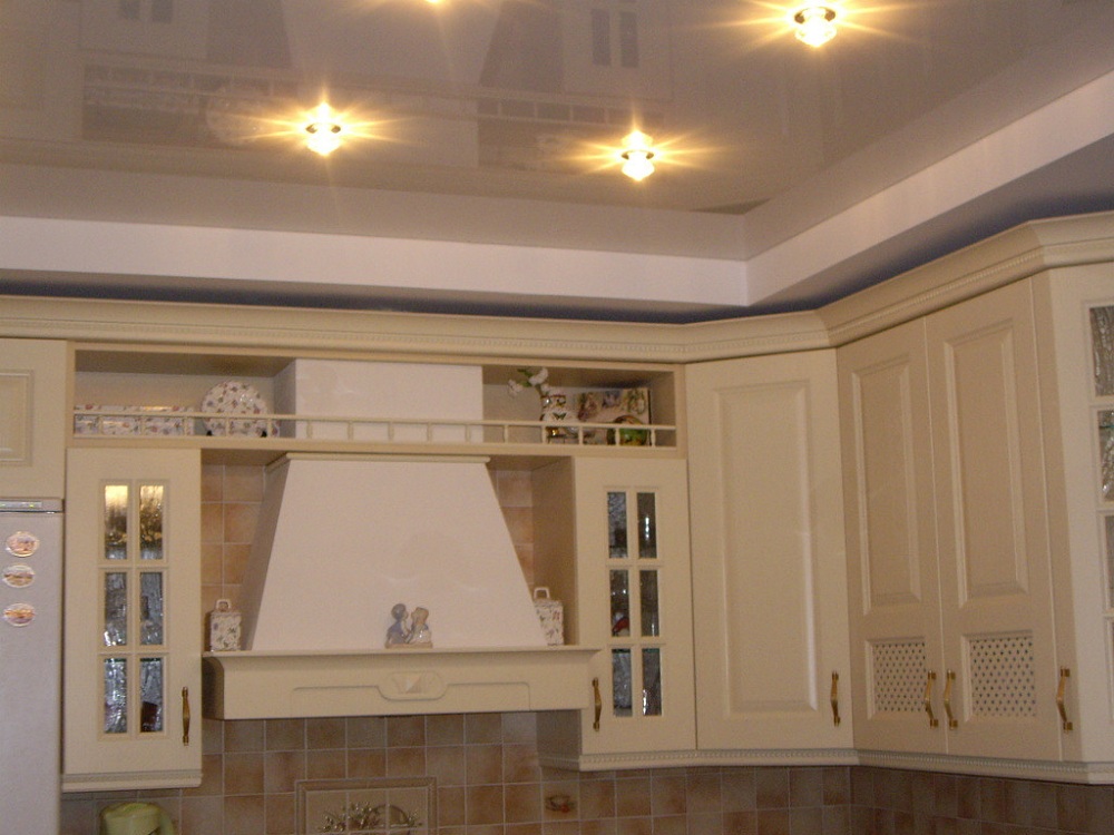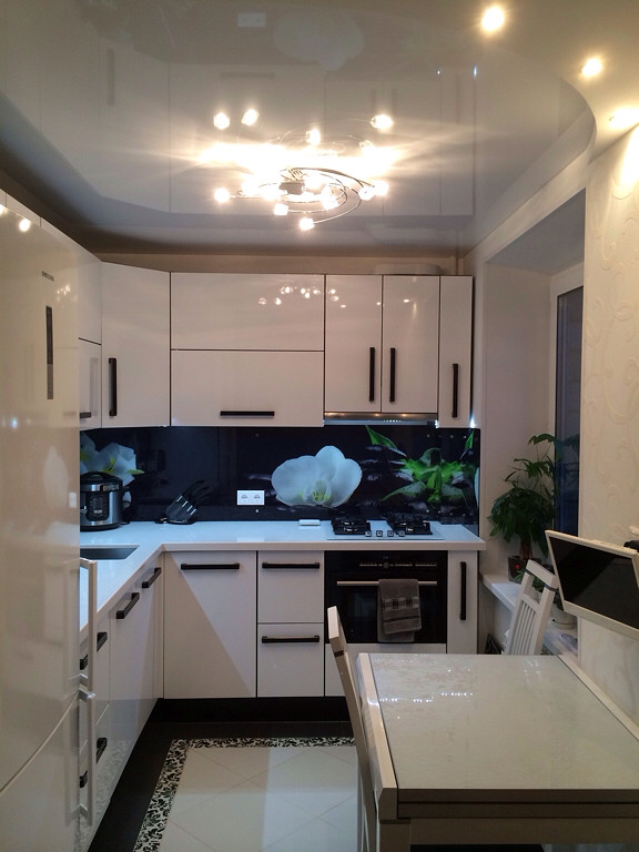 Потолок лучше будет смотреться натяжной глянцевый белый из полотна ПВХ. В высокой кухне поможет создать перспективу многоуровневый потолок: гипсокартонный или натяжной. Любые цветные или темные варианты будут воздавать ощущение висения над головой.
