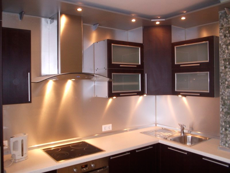 Для рабочей зоны подойдет декоративная подсветка или светильники, встроенные в навесные шкафы. Максимально удобным считается установка поворотных осветительных приборов, например спотов.