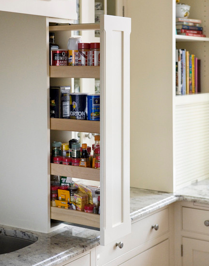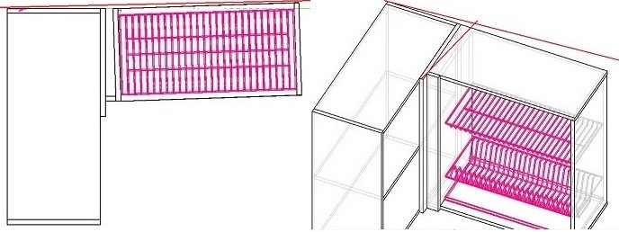 Аналог популярной бутылочницы, которую часто используют в напольных шкафах. Прекрасно заполняет неудобные узкие ниши, которые часто остаются при проектировании гарнитура в малогабаритной кухне. Выдвижная конструкция с 2-3 полочками крепится к фасаду и позволяет по-максимуму использовать объем шкафов.