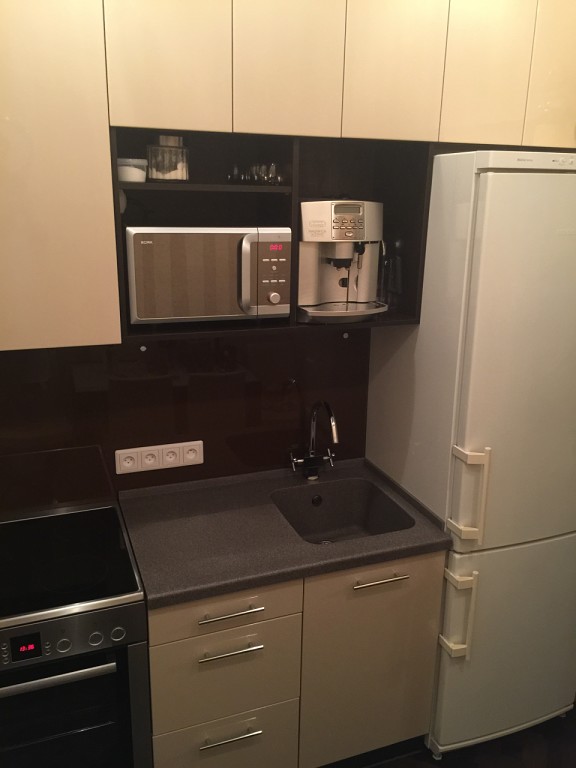 Бытовая техника на маленькой кухне должна быть встроенной. Это значит, что все приборы, которые можно спрятать за фасадами, нужно за ними спрятать. Микроволновая печь, электроплита с духовкой, холодильник, посудомоечная машина, кухонный комбайн — все это должно быть грамотно встроено в гарнитур. Возможно, от некоторых бытовых приборов придется отказаться — к примеру, установить на кухне либо духовку, либо микроволновую печь.