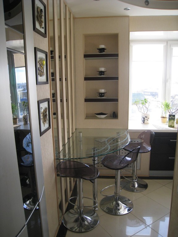 Изюминкой дизайна может стать хрустальная люстра. Она позволит заиграть помещению новыми красками и визуально «приподнимет» потолок. Создать неповторимую атмосферу комфорта и подчеркнуть безупречный вкус хозяйки помогут изящные вазы с фруктами, растения в горшочках, необычные часики. Не стоит бояться оригинальных решений. Следуя советам профессионалов, их можно воплотить в жизнь даже в небольших кухнях.