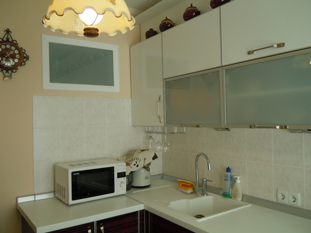 Чаще всего в небольшом помещении устанавливают встраиваемую технику. При этом производителями кухонных приборов учитываются все нюансы, и выпускается множество самых разнообразных моделей. Между прочим, подобную технику можно вмонтировать даже в стену, что добавляет вариативности и освобождает столь необходимое пространство. Встраиваемая техника будет несколько меньше привычной нам, однако в этом есть масса плюсов, ведь небольшой семье будет вполне достаточно варочной панели на две-три конфорки или маленького холодильника. Также специально для малогабаритных кухонь производят небольшие и лёгкие духовые шкафы и микроволновки, которые устанавливаются на кронштейнах над рабочей поверхностью.