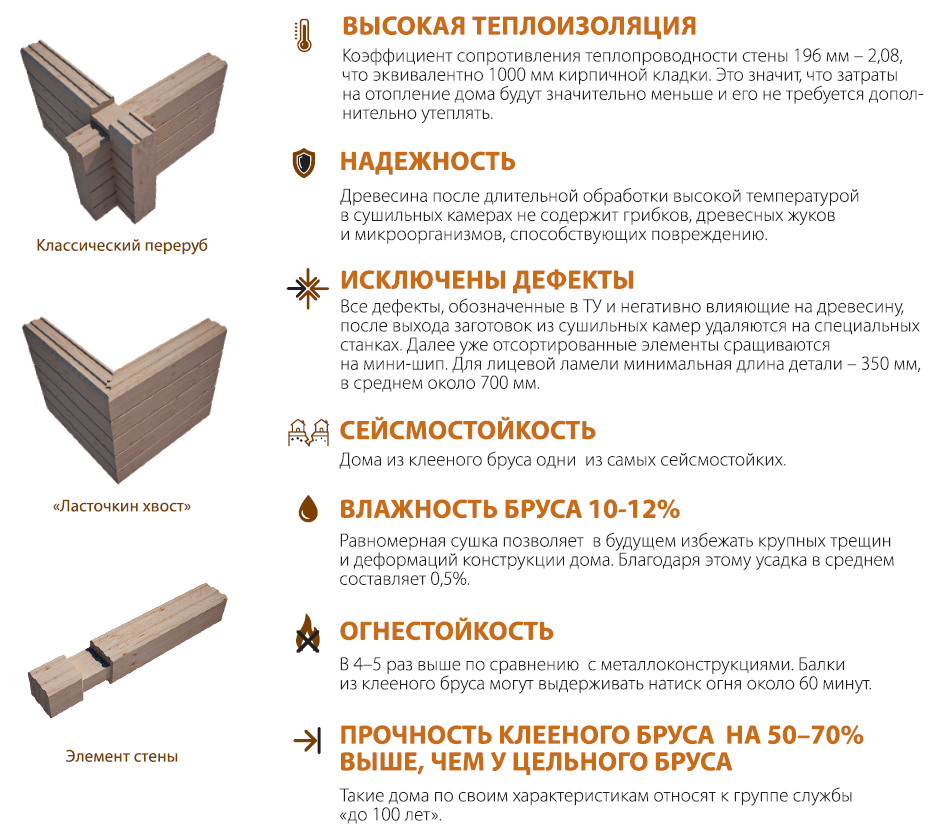 Брус, изготовленный по современной технологии методом склеивания различных пиломатериалов, объединяет в себе практически все достоинства натуральной древесины.