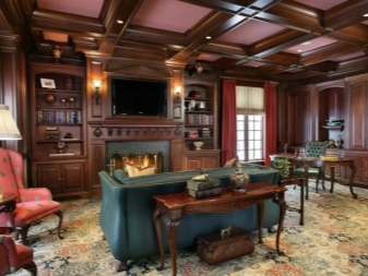 Для английского стиля характерно большое количество дерева в интерьере. Идеально подходит для внутренней отделки комнаты красное дерево. Дорогой и элегантный материал отлично дополняет консервативный стиль. И это касается не только пола, потолка и плинтусов, но и потолочных балок и стеновых панелей в сочетании с обоями.