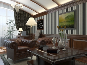 Нижняя часть стены, как и пол, должна иметь деревянное покрытие. Сверху могут быть наклеены обои с геометрическим рисунком или плотными растительными узорами. Стык закрывается деревянной рейкой на уровне спинки дивана. Часто в качестве отделки стен используется светлая краска в сочетании с деревянными рейками.