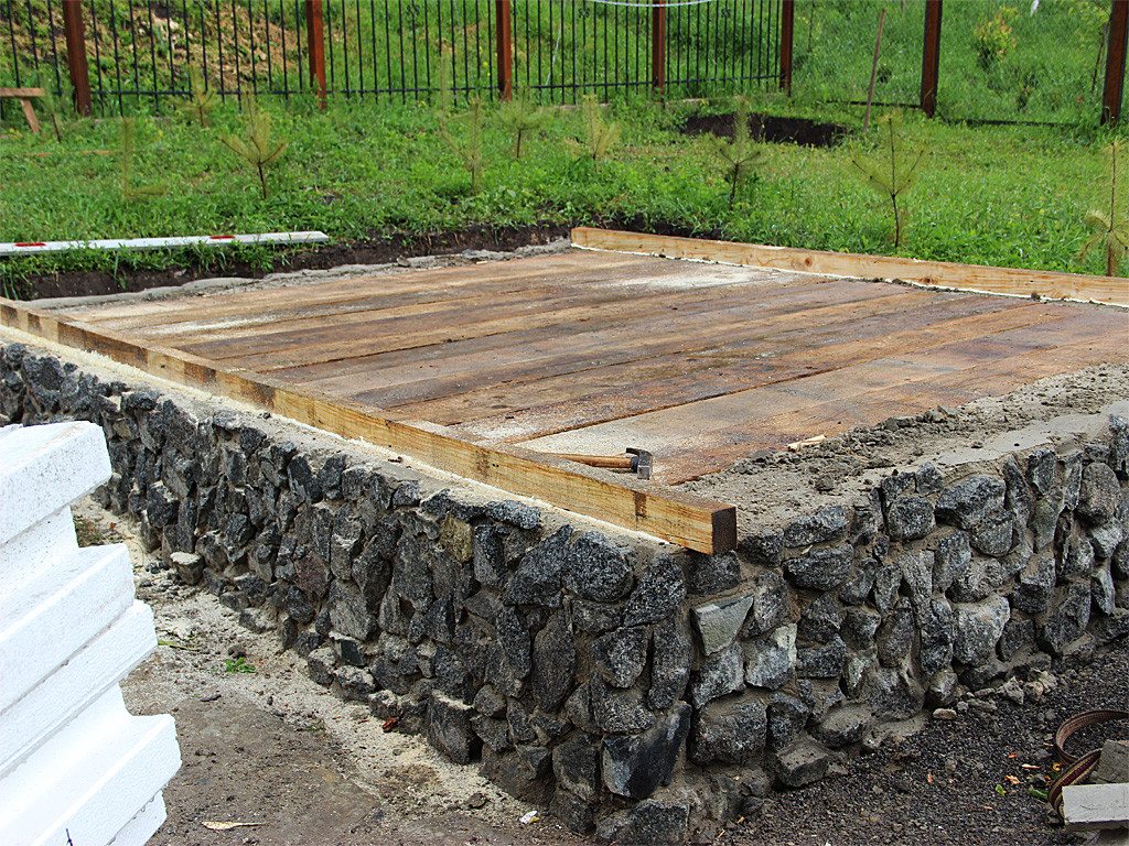 После заливки основание дополняется опорой. Для этого деревянные бруски размером в 50х60 мм прокладываются по всему периметру фундамента. Всю оставшуюся площадь нужно проложить досками аналогичной толщины.