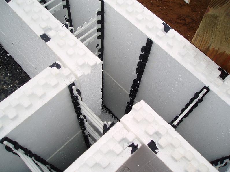 Пенопластовые элементы устанавливаются на фундамент и металлическую арматуру, стыки и соединения скрепляются пеной или клеем. Монтаж каждого ряда заканчивается заливкой бетона в пустоты опалубки.