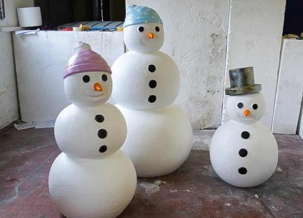 Чтобы создать устойчивую фигуру, нужен пенопласт толщиной от 5 см. На нём рисуется конур снеговика и вырезается с помощью острого ножа или электрического лобзика. Чтобы убрать все неровности, понадобится наждачная бумага. После тщательной шлифовки, прорабатываются детали. Нужно нарисовать контуры глаз, шапку, пуговицы.