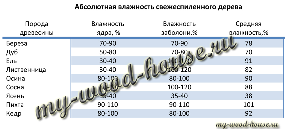 При спиле в обычных условиях влажность разных пород древесины имеет следующие средние значения: