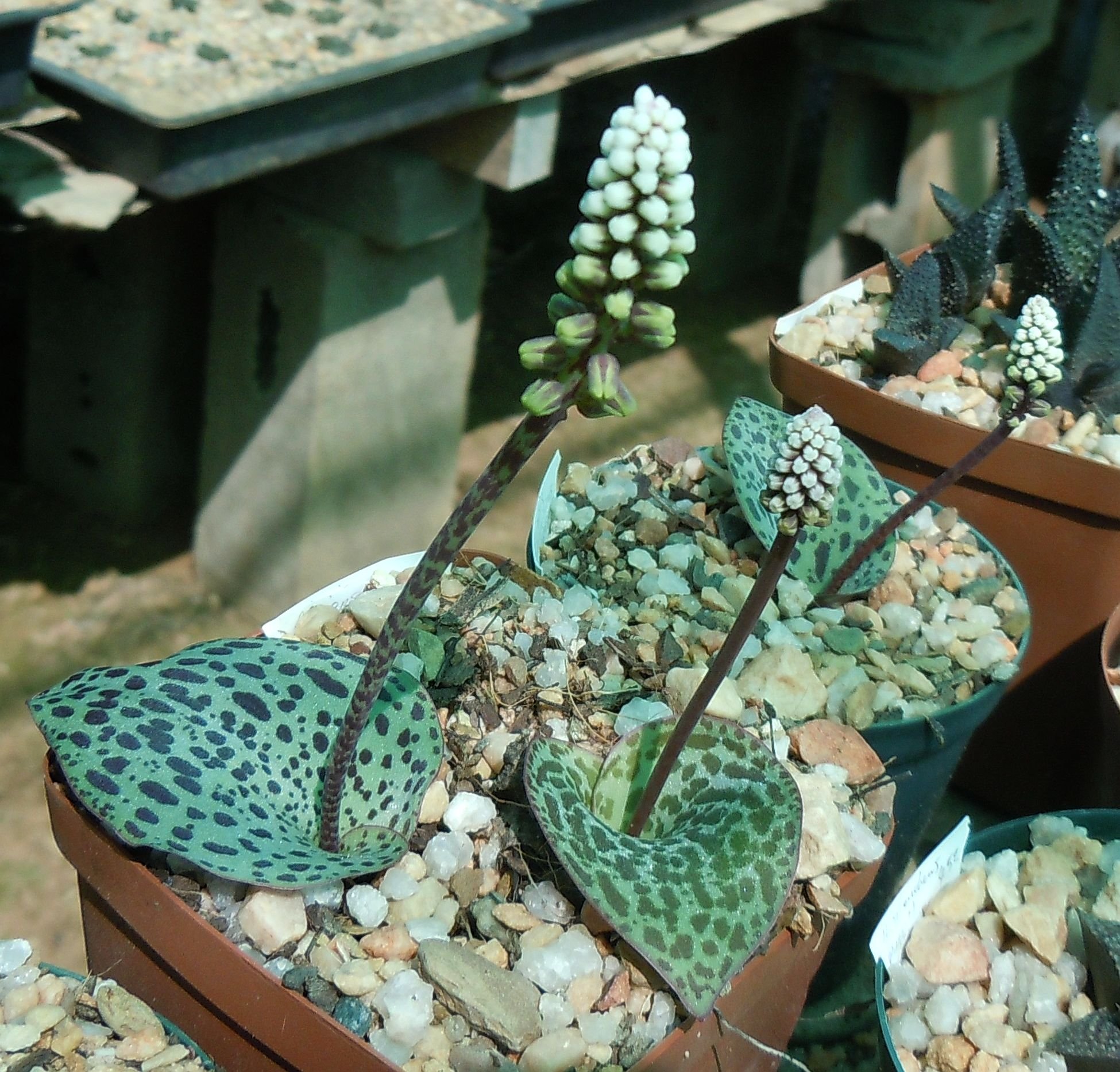 Drimiopsis Кирка (Drimiopsis kirkii Baker). Синоним: Ледебурия ботриовидная (Ledebouria botryoides (Baker) J. C. Manning & Goldblatt). Родина вида — Тропическая Восточная Африка. Вечнозеленые луковичные растения; луковица небольшая округлая, белая. Листья ланцетные, до 40 см длиной и 5 см шириной (в широкой части пластинки), суживающиеся к основанию, светло-зеленые, в темно-зеленых пятнах, снизу серовато-зеленые. Цветонос 20—40 см высотой. Цветки мелкие, белые.