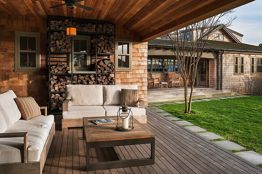 Веранда в пляжном стиле предлагает достаточно места для хранения дров