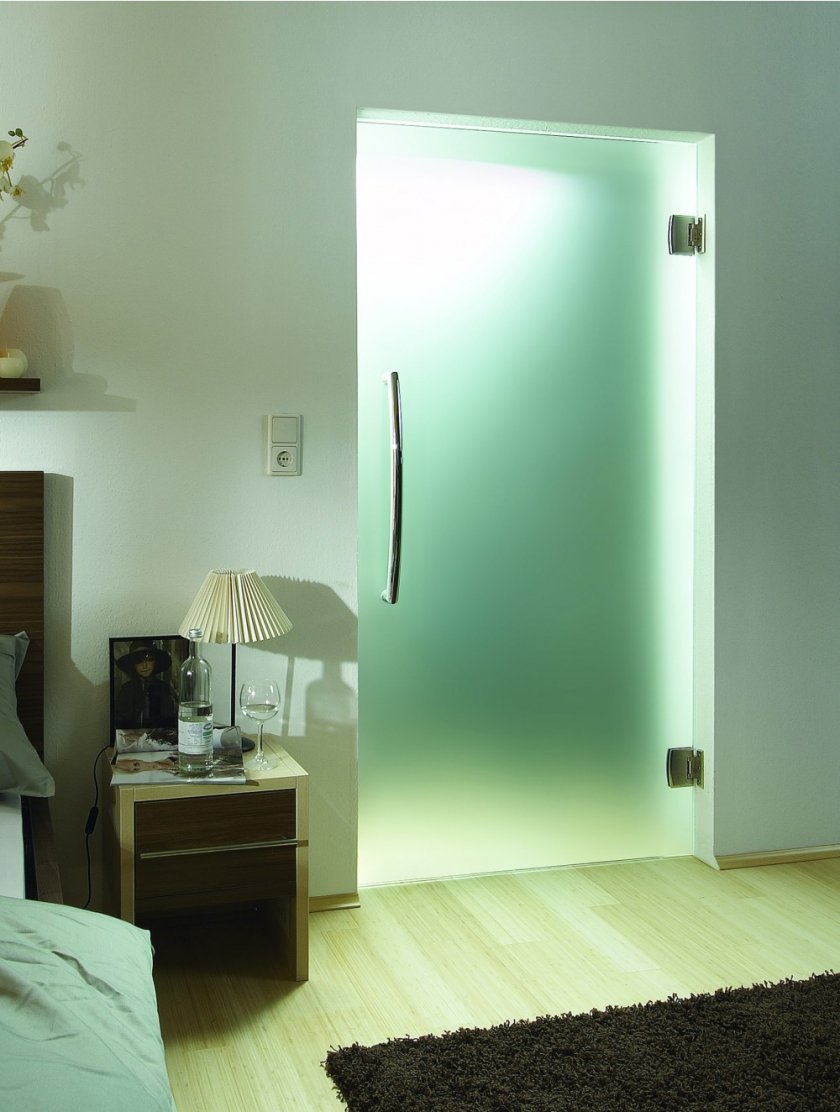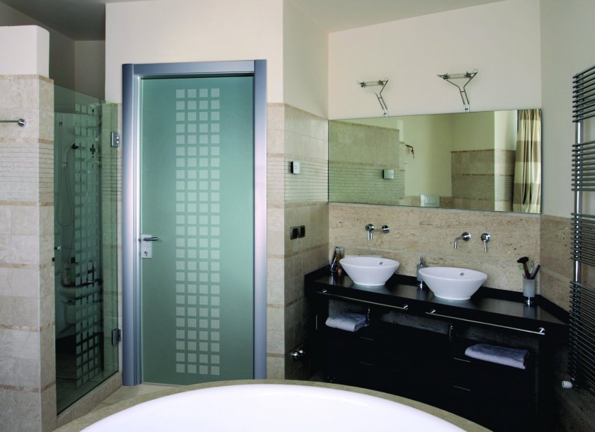 Современные стеклянные двери имеют высокую прочность. Для санузлов используют непрозрачные или матовые двери.