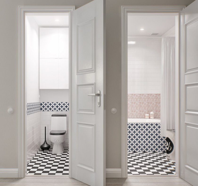 - Дверные проёмы ванной комнаты и туалета по максимуму отдаляют друг от друга.