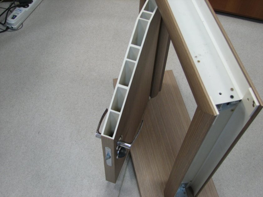 Стоит также отметить, что изделия с поливинилхлоридным покрытием в целом уступают в эстетической ценности деревянным и стеклянным моделям. Но при этом им присуще такое же разнообразие форм и расцветок, которые можно подобрать к уже сформированному интерьеру по фото в любом каталоге. Благодаря современным технологиям многие относительно дешевые пластиковые конструкции успешно имитируют, например, ценные породы дерева или зеркальные панели.