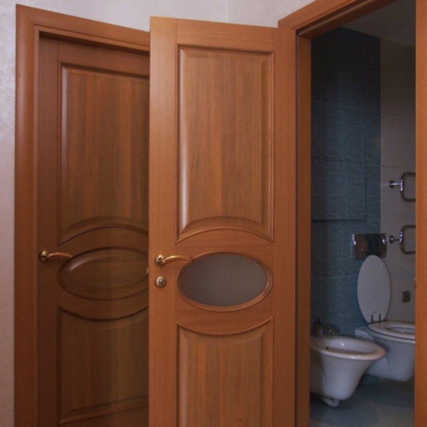 Дверь из шпона – это дверь, сделанная из дешевого дерева низкого сорта и обклеенная тонким слоем более дорогой древесины. Она не очень подходит для санузлов, так как шпон не устойчив к влаге.