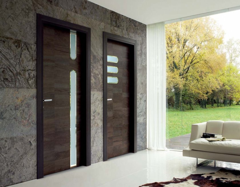 Такие двери называются комбинированными. Обычно они декорируются вставками из непрозрачного, закаленного или многослойного стекла.