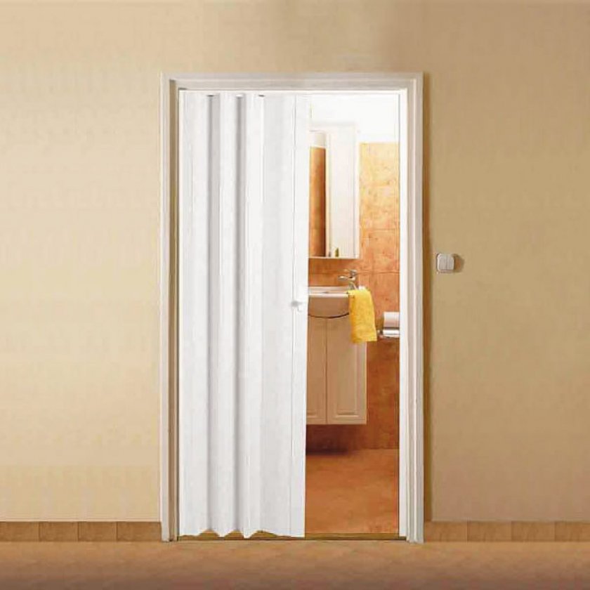 Самые простые для ванной и туалета являются складные двери. Створка выполнена в виде гармошки или книжки, не заходящей при открывании за стену. Боковое пространство остаётся свободное, но уменьшается ширина дверного проёма. При установке двери гармошки в ванную комнату решается вопрос обустройства вентиляции, зато утрачиваются изоляционные свойства. Створки неплотно прилегают к нижней части дверной коробки, и образуется зазор.