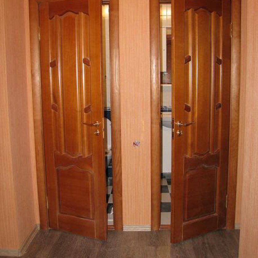 Деревянная дверь, конечно, красива, но стоит не дешево. Двери из дерева в ванную и туалет должны покрываться лаком для защиты от влаги.