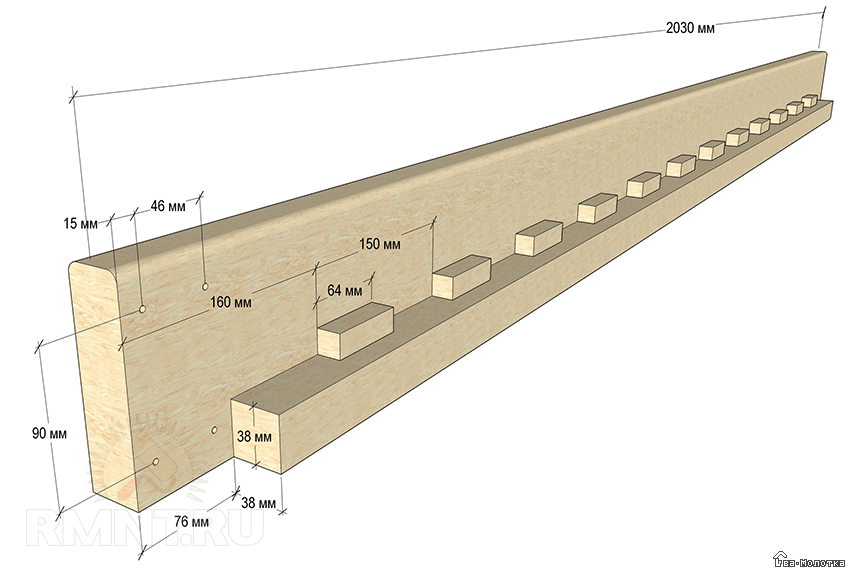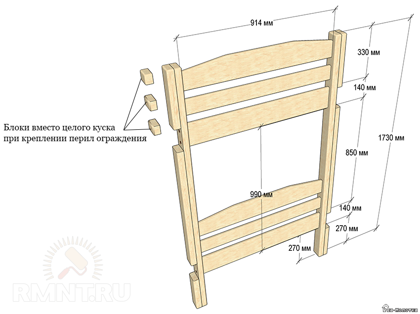 Лестница и ограждение просто фиксируются на каркасе шурупами. При желании ограждение можно сделать и со стороны стены — для нижней и верхней постели. Тогда вам потребуется ещё четыре планки.