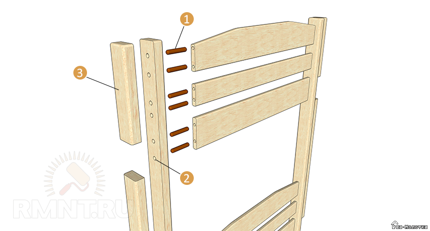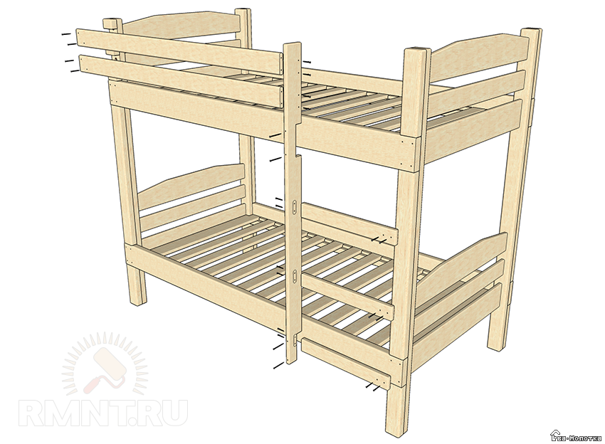 Изножье и изголовье соединяются в нижней части с досками несущей рамы с помощью шурупов. После этого укладываются поперечные рейки, держатели матраса, причем крайние из них подпиливаются в уголках для плотной установки. Их закреплять не нужно. Таким же образом выполняется и сборка второго яруса.