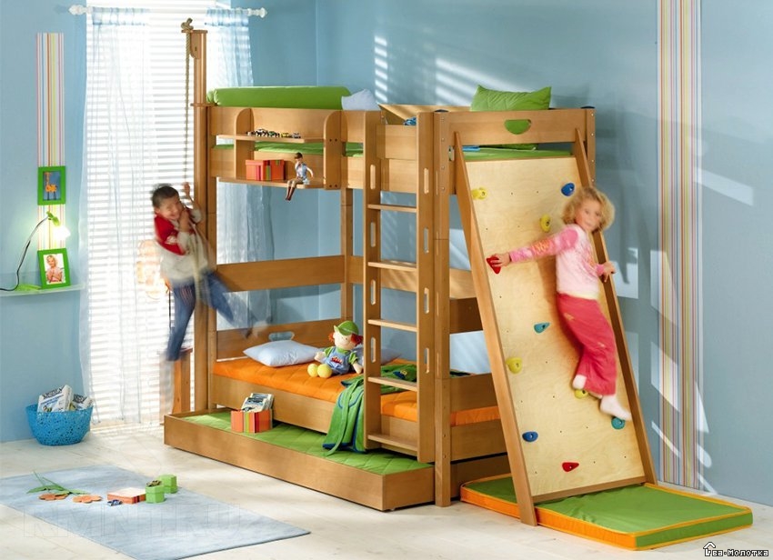 Если же в вашем доме сразу трое малышей, обратите внимание на модель с выдвижными ящиками. Именно они и будут выполнять роль лестницы