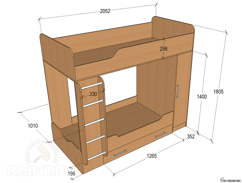 Нижний ярус тоже должен быть просторным. Ниже мы предлагаем подробные чертежи классической двухъярусной кровати, рассчитанной на комнату с потолком высотой в 2,5 м. Толщина матраса в кроватках, которые мы предлагаем, около 20 см.