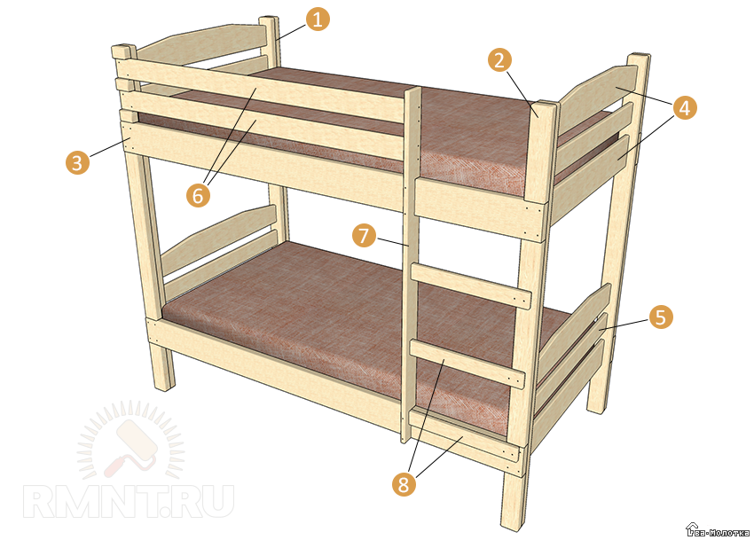 1 — вертикальные стойки (ножки); 2 — внешние накладки на стойки; 3 — доски несущей рамы; 4 — верхние и нижние планки изголовья; 5 — центрадбная планка изголовья; 6 — боковые ограждения; 7 — перила лестницы; 8 — ступени лестницы