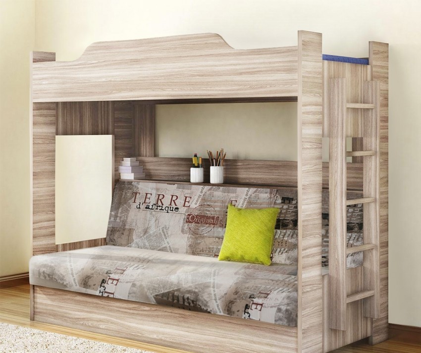 Из-за своего размера двухъярусные кровати не столь удобны детям-подросткам, которые привыкли брать книгу с прикроватной тумбочки и ставить телефон или планшет туда же на подзарядку. Придется постоянно карабкаться то вверх, то вниз, при этом маленькая полочка у кровати наверху не решит проблему до конца. Зато можно купить кровать с диваном, внизу получится мини-гостиная!