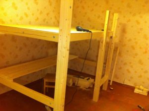 - Переходим к столу. Его мы будем крепить за торцовые балки кровати двумя металлическими уголками. Еще по 4 уголка потребуются для крепления ножек стола. При желании можно сделать складной механизм из системы петель и триггеров. Ограничены вы только своей фантазией, и, как пел Егор Летов, «простор открыт»!